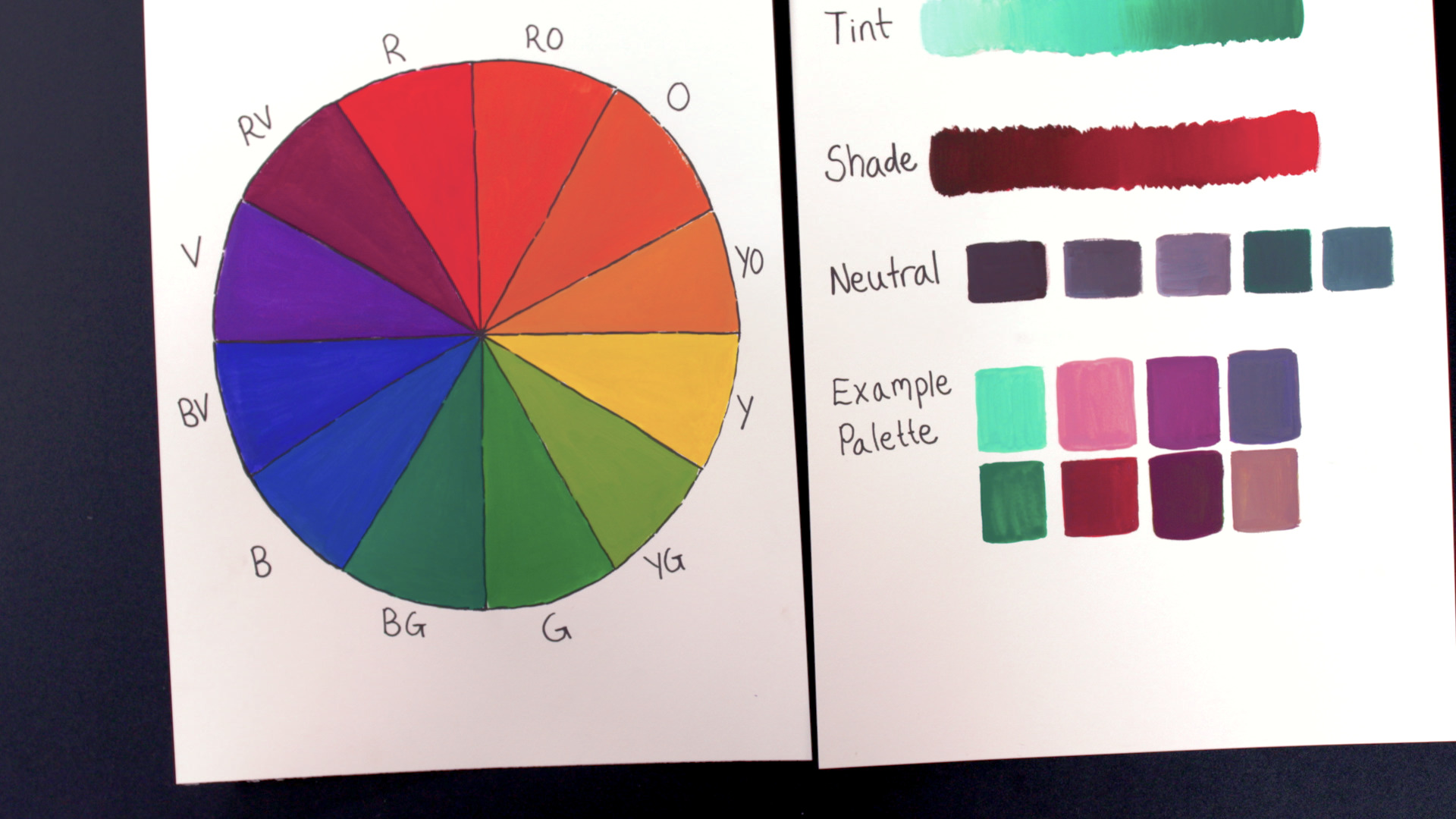 And then for shade, you add black to a color. So I added black to this red, and you can see the variation of colors that you can get from adding black to a color. Now neutrals are things like white, browns, and grays. They're sort of more subdued colors and they can just be a really good complement because they're a fresh, like a break for the eye from some brighter colors. So in an example palette that I have, I took some knowledge of the color wheel.