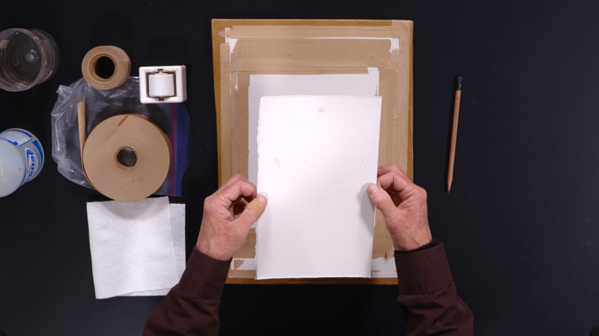 Using straightforward tools like a drywall board, gummed brown paper tape, a mister or roller-style envelope wetter, and a few household items, Stuart demonstrates how to prepare your surface, saturate and stretch the paper, and tape it down at just the right moment. Along the way, he shares invaluable tips on timing the paper’s moisture level, avoiding weakened tape seams, and choosing the right mounting surface.